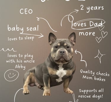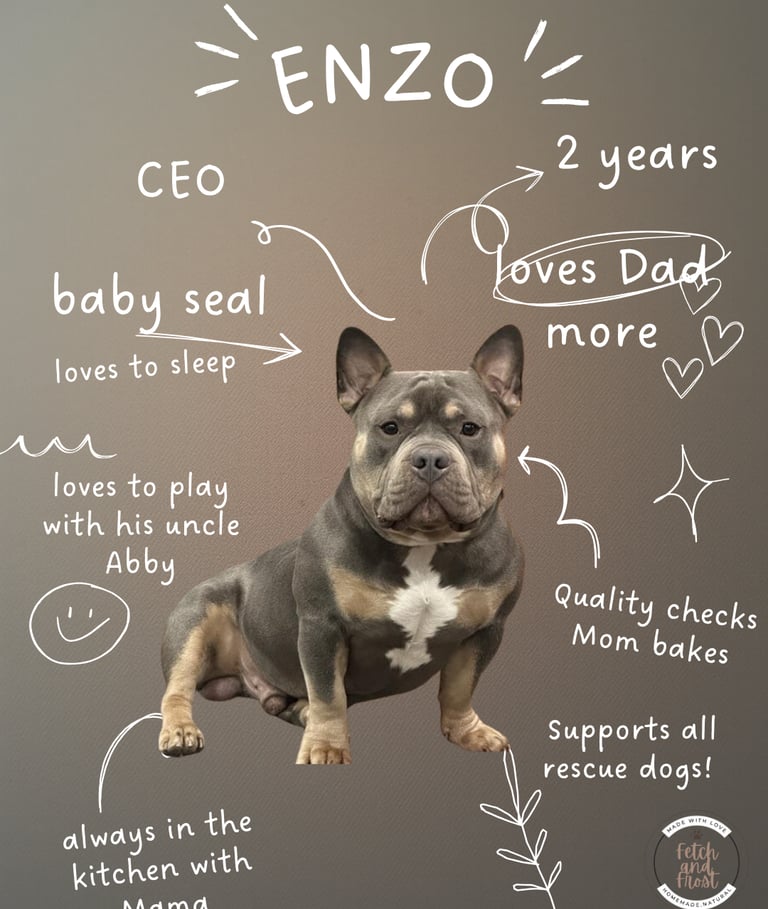 Fetch & Frost was born from a simple love story — the one between me and my pup, Enzo. As an American Bully with a big personality and an even bigger appetite, Enzo inspired me to create cakes and treats that are not only delicious but also safe, wholesome, and made with real love.